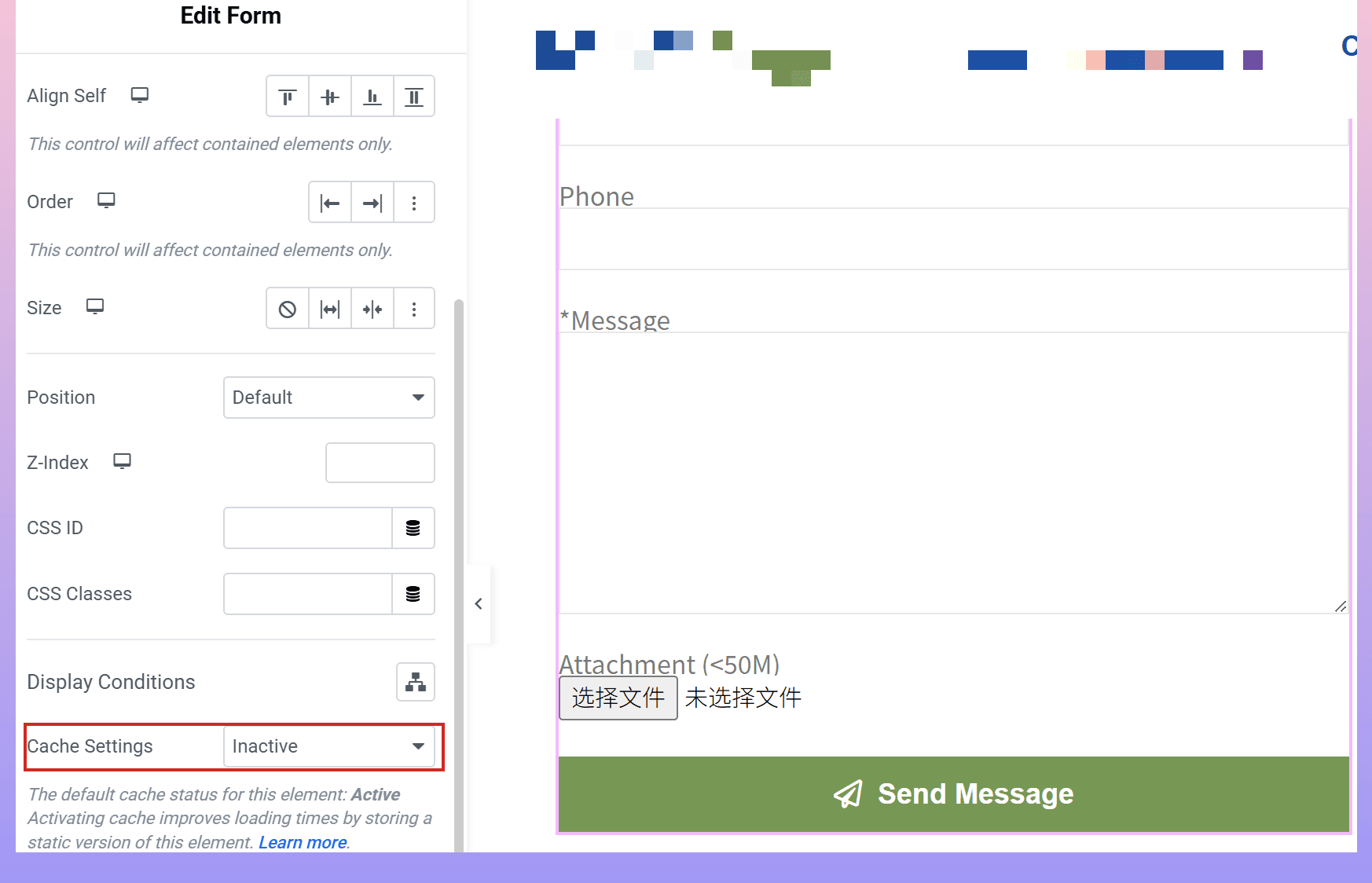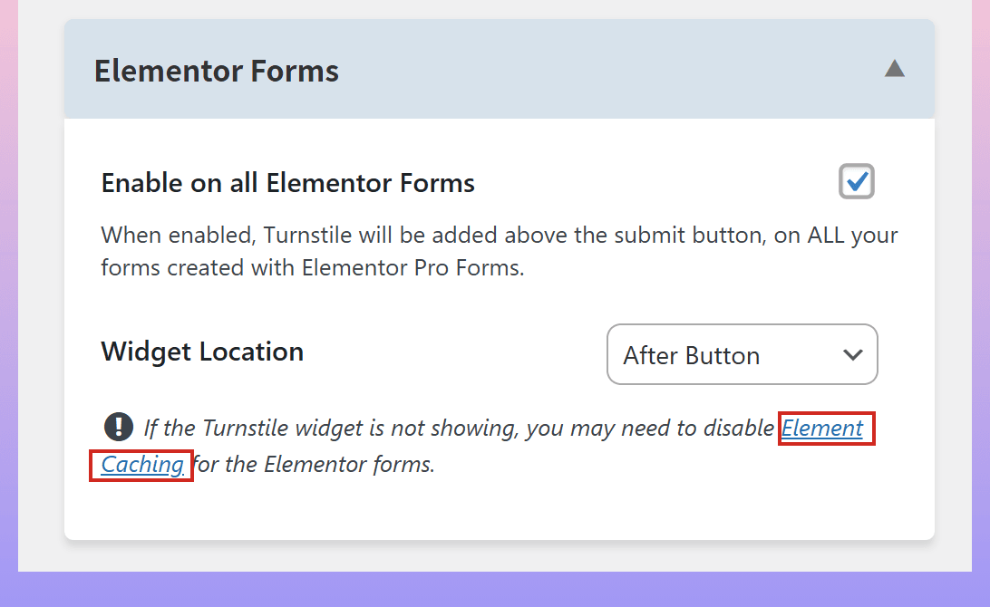 最后在验证码插件的设置中看到了解决方法(插件为Simple CAPTCHA Alternative with Cloudflare Turnstile),按插件提示,这个问题可能与最新的Elementor元素缓存功能(Element Caching)有关,它把验证码缓存了,导致无法正常显示。