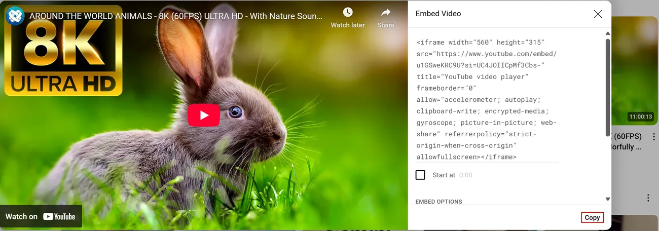 在你需要插入的YouTube视频上点分享,然后获取嵌入代码,直接点【Copy】复制。