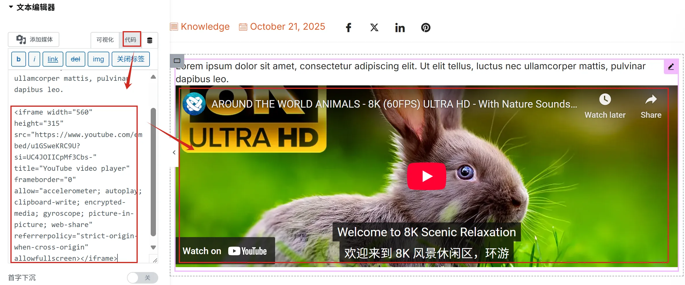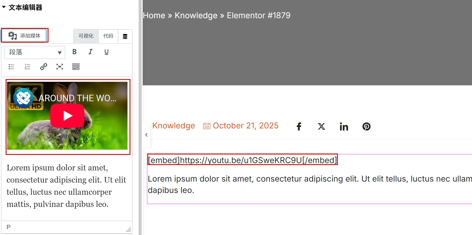 但是,当使用这个文本编辑器插入YouTube视频时,可能会遇到一些问题。如上图所示,当从【添加媒体】这里直接插入YoutTube视频链接时,在文本编辑器中,视频可以正常显示,但是实际预览时不能显示。