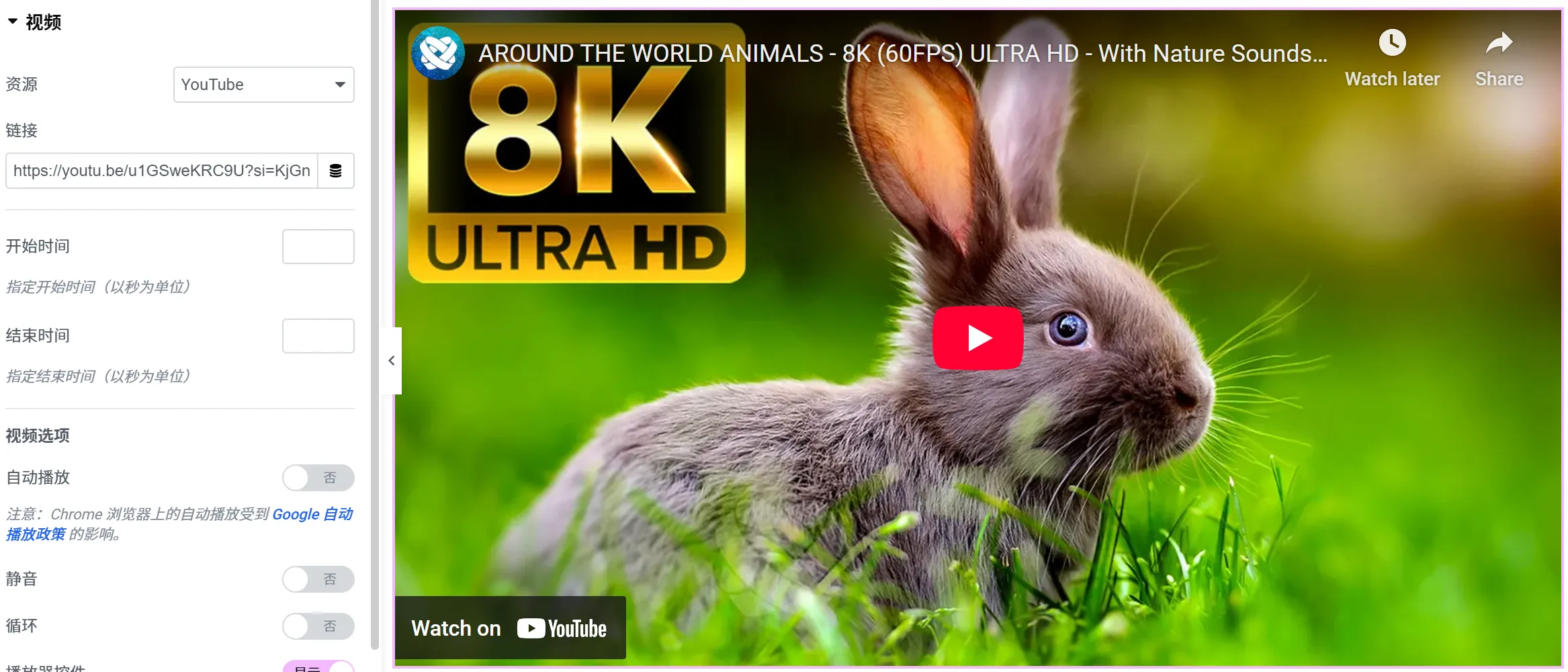 选中VIDEO/视频模块后,在左边的设置中填写YouTube视频链接就可以了。