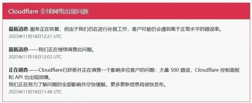 北京时间11月18日22:30,Cloudflare核心流量已基本恢复正常。在随后的数小时内,工作重心转入全面缓解全球网络各分区的负载压力,以应对流量逐步回升带来的挑战。至北京时间11月19日01:06,随着所有系统稳定运行,Cloudflare服务已宣告全面恢复。