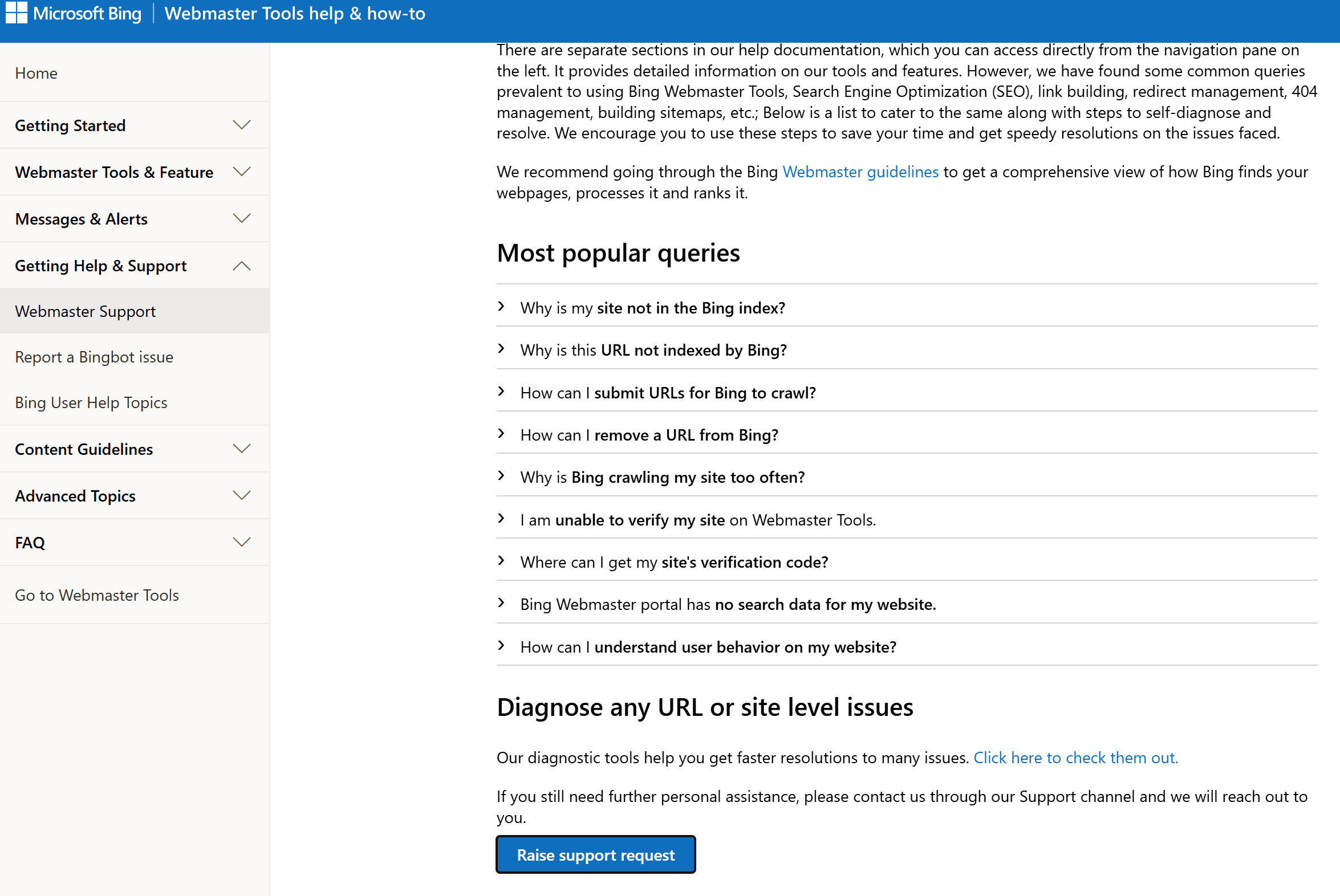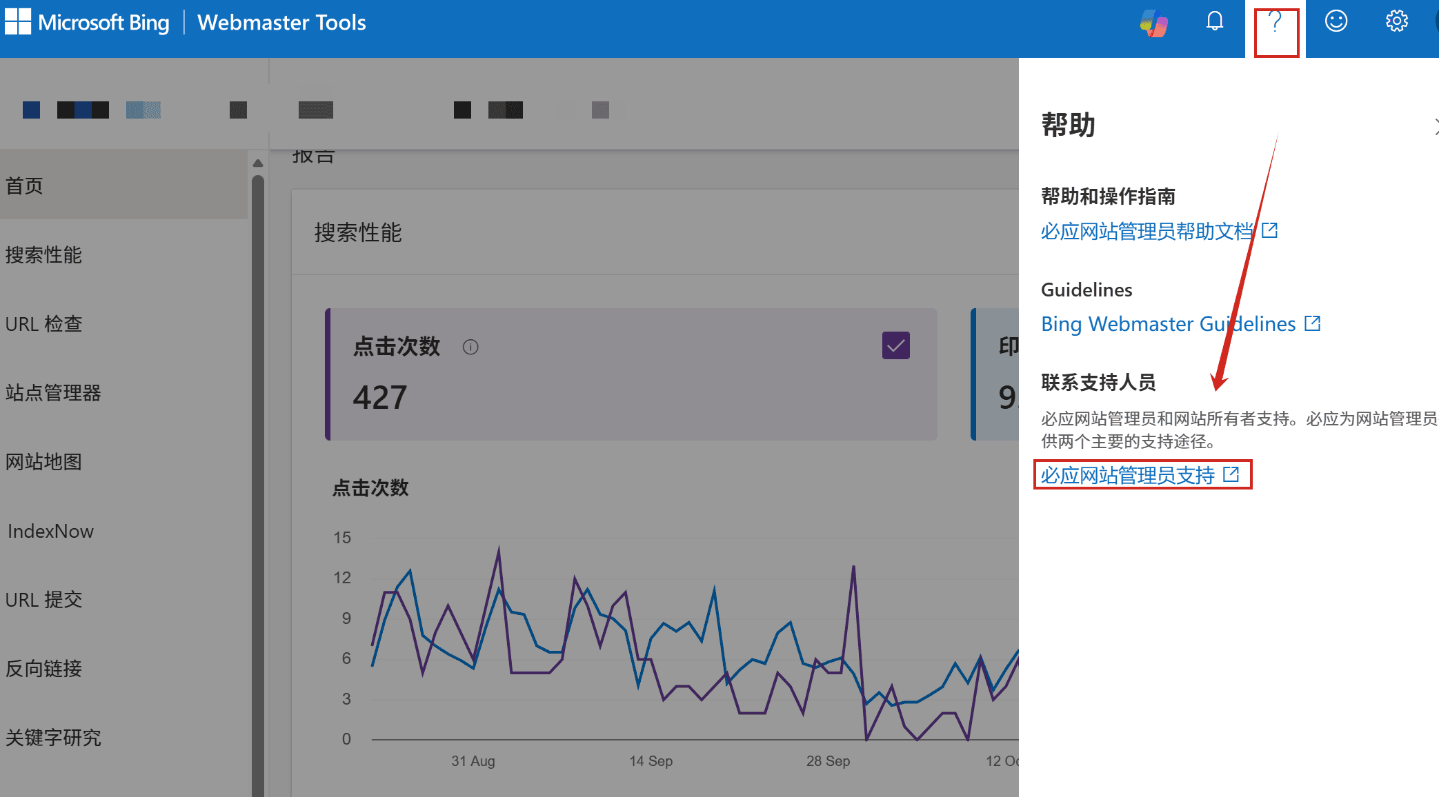 网站添加到Bing搜索后,进入webmasters管理页面,点右上角的问号按扭,然后再点【必应网站管理员支持】。
