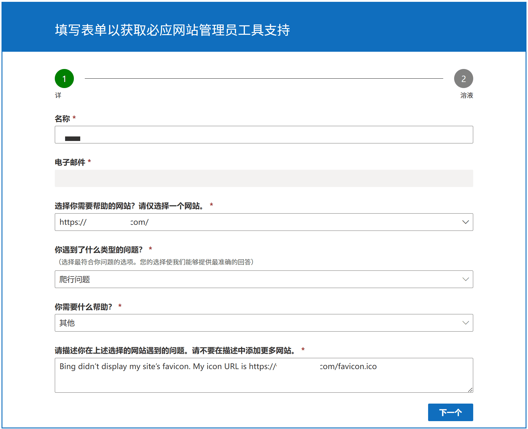 然后填写你的联系名,选择有问题的网站,问题选【Crawling issue/爬行问题】,下面选其它。最后的问题描述可以参考上面这样写,最好翻译成英文,然后点【下一个】