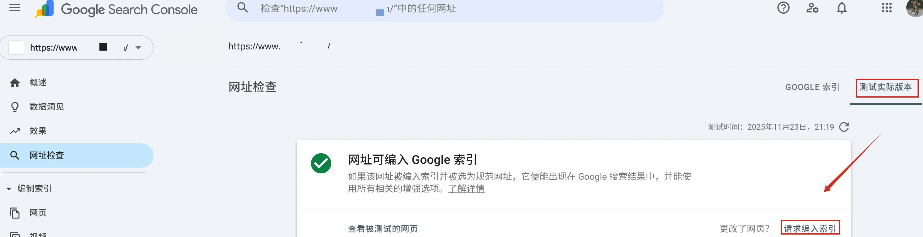 打开谷歌站长/Google search console后台,选中你的网站,打开【网址检查】输入你的网站首页url,然后回车。然后它返回的结果不管是已收录还是未收录,先点右上角的【测试实际版本】,然后再点【请求编入索引】。