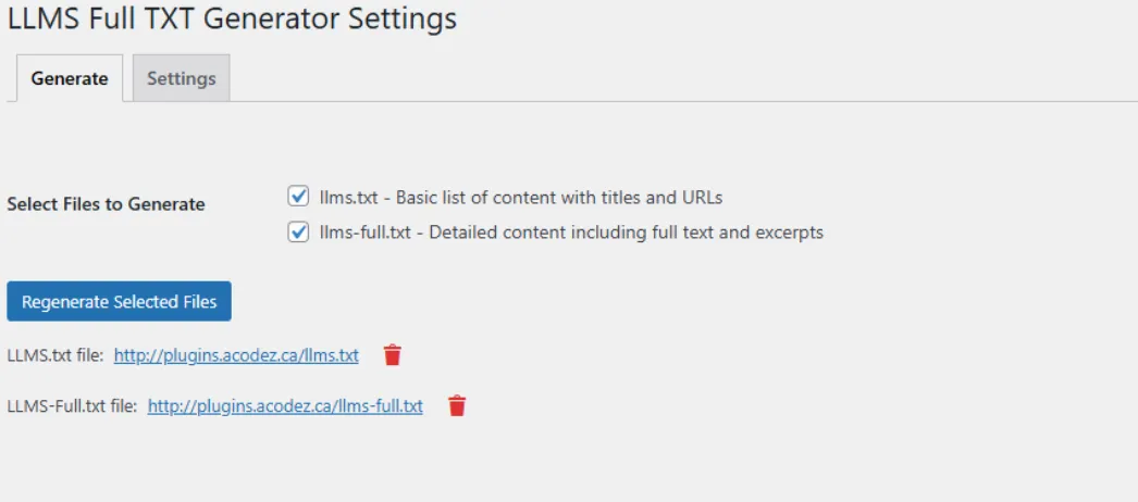 3.选择需要生成的类型(图3),有 llms.txt,llms-full.txt,后者含摘要详细信息。选好后点Regenerate Selected Files按扭既可生成。